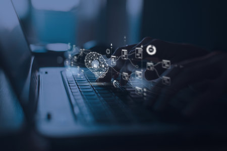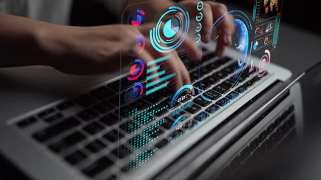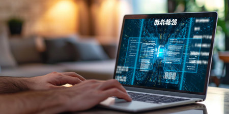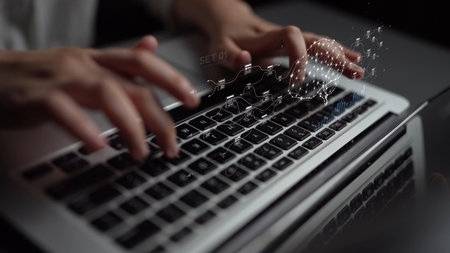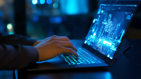 Hands Typing on Laptop with Digital Binary Code and Data Visualization Overlays in Modern Workspace Setting