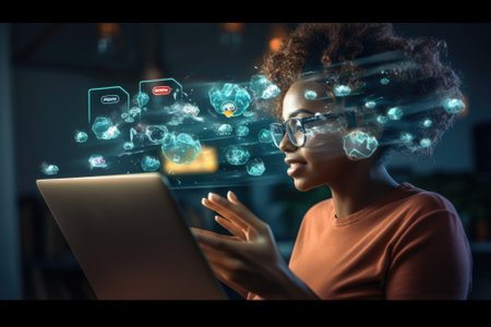 Concept of artificial intelligence use analytics, automation. woman using laptop and infographic on screen. generative ai