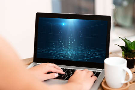 A women using laptop on the table at in cafe shop. She is asian women. She shopping online by laptop or notebook. She siting on the wood table. And have code programmer hologram effect in image.