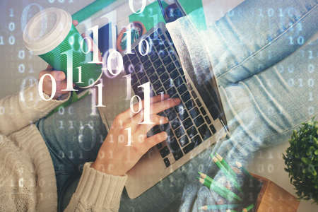 Abstract creative coding illustration with hands typing on laptop on background, software development concept. Multiexposure