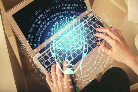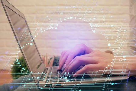 Double exposure of woman working on computer andhuman brain hologram drawing. Top View. Ai concept.