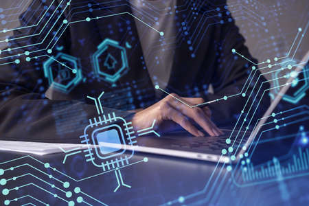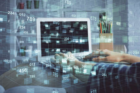 Double exposure of woman hands working on computer and data theme hologram drawing. Tech concept.