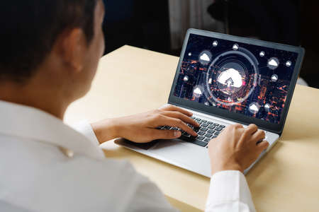businessman worker are working online with laptop, graphic of communication network and cyber space connection, concept of online marketing