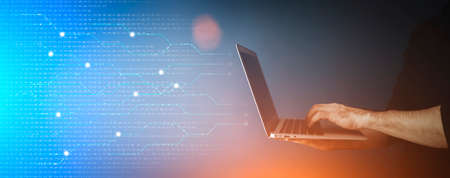 hands on laptop programming web coding front-end web developing. mix media background
