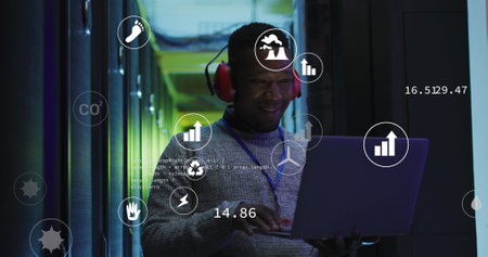 Image of digital icons against african american male engineer with laptop working at server room. Computer interface and business data storage technology concept