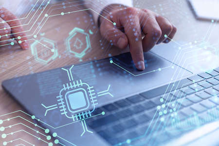 Close-up hands with laptop during online working. Double exposure - icons, connections and schematic representation of the global communication network Internet.
