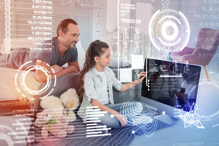 Clever daughter. Smart calm girl using a modern device while her kind attentive father looking at it and feeling proud