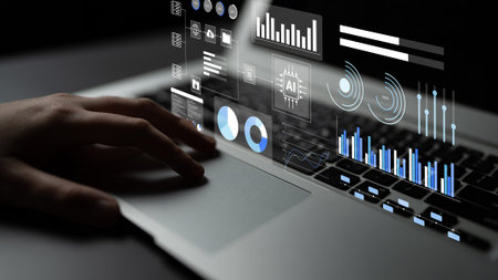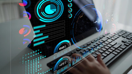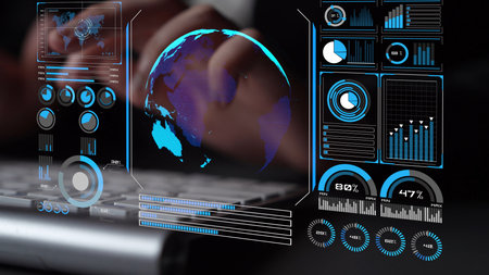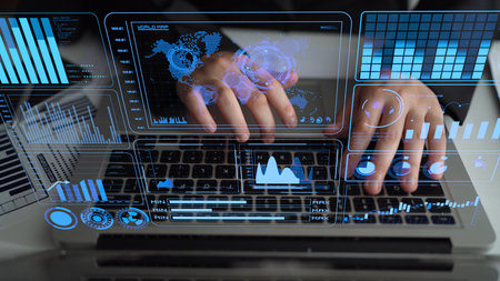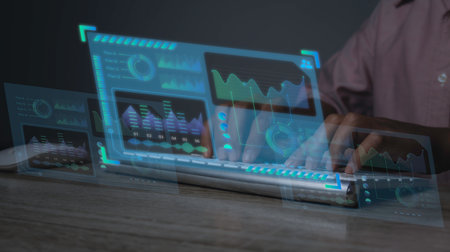This image showcases a futuristic display of digital data visualization on a laptop, emphasizing charts and analytics essential for business decisions in a modern workspace.