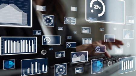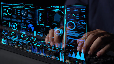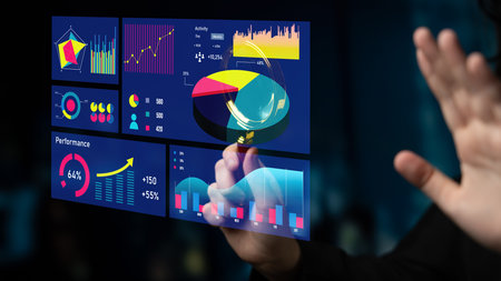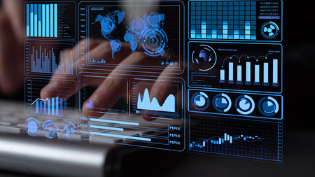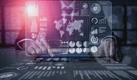 Big Data Technology for Business Finance Analytic Concept. Modern graphic interface shows massive information of business sale report, profit chart and stock market trends analysis on screen monitor.
