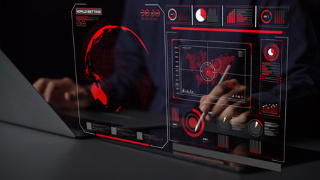 Projecting holographic world map interface at dashboard, line graph, heatmap analytics, copy space. Futuristic, technology, interface, analytics, data, visualization, neon