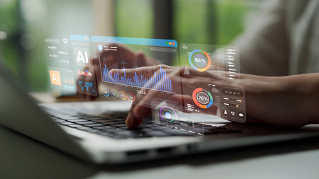 User typing on a laptop with virtual screen of performance graph dashboard. Concept for financial, business, progress performance and dashboard.