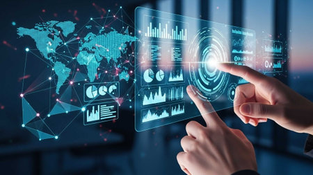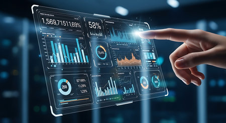 A professional woman engages with digital data analysis in a modern office. The screen displays various graphs and charts, highlighting business insights and trends.