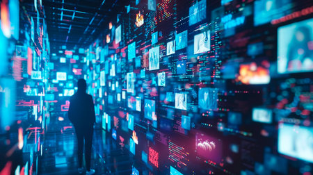 This visually striking image depicts the complex and dynamic infrastructure that supports modern digital entertainment and streaming platforms Featuring a futuristic,abstract design with a matrix of