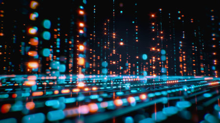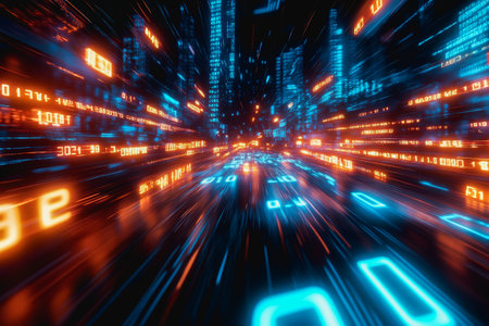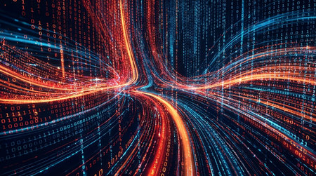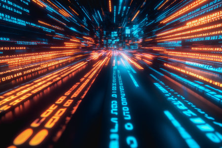 Abstract digital data streams with binary code and glowing orange and blue light trails