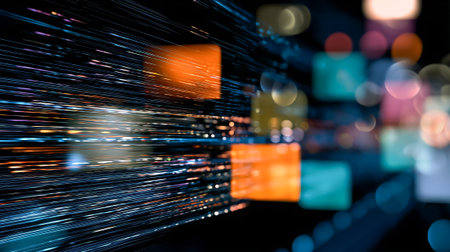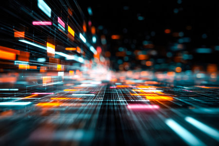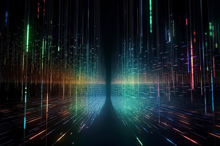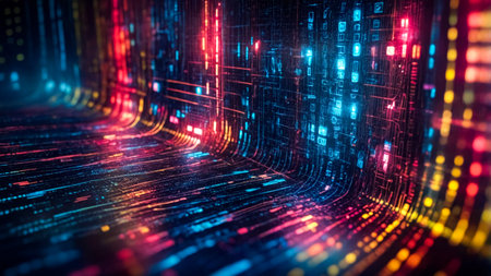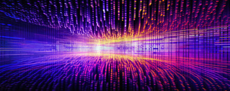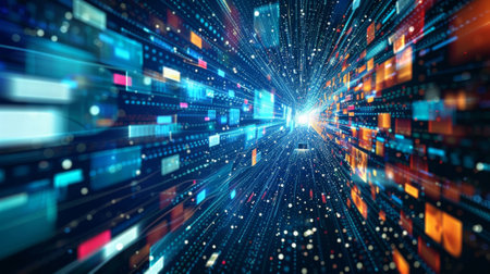 This captivating image features a dynamic stream of data flowing through a digital space, showcasing vibrant light effects that signify technology and information advancement.