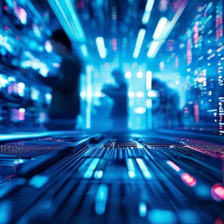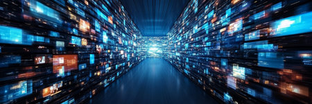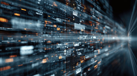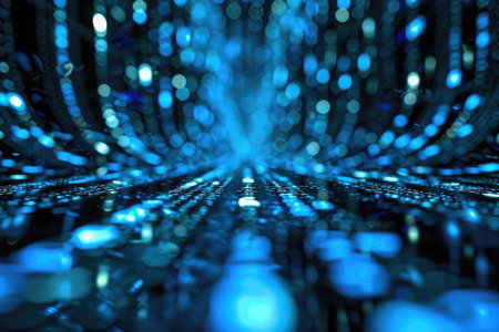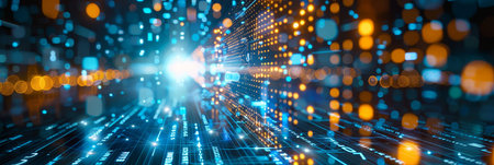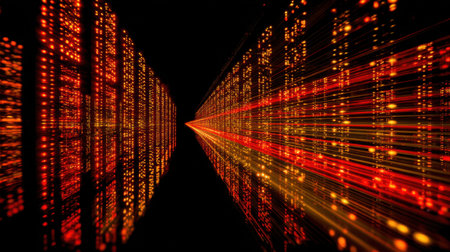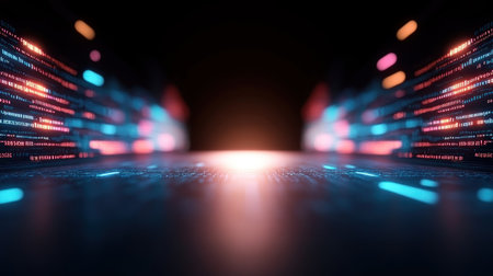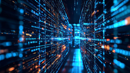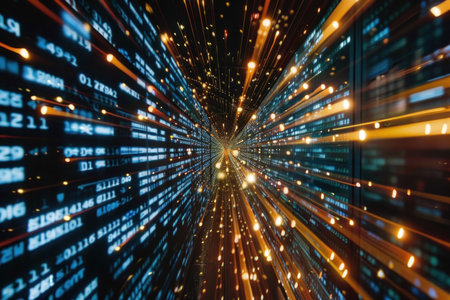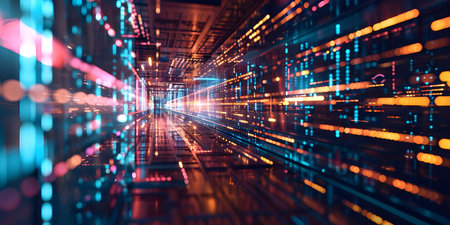 Abstract view of a futuristic data center with glowing binary code, lights, and high-speed data transfer. Depicts technology, communication, and big data concepts.