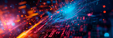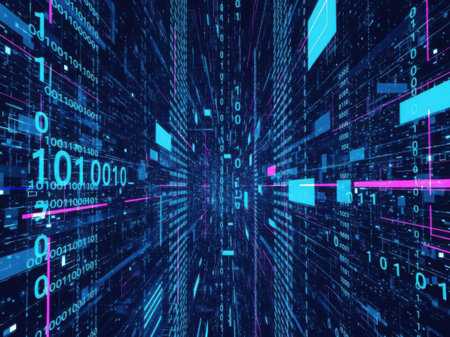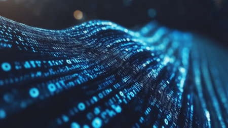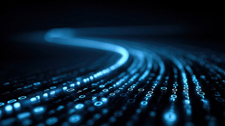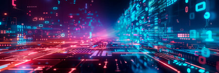 Glowing binary code streams in a high-tech, futuristic digital scene.