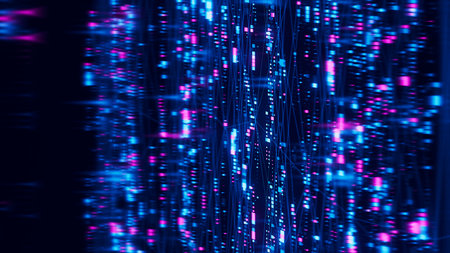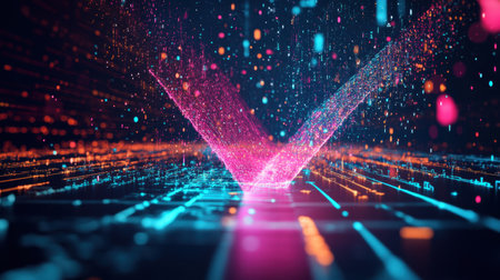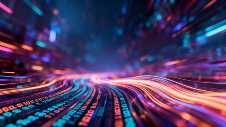 This stunning abstract image captures a mesmerizing stream of binary code, illuminated by vibrant neon particles, creating a futuristic digital atmosphere.
