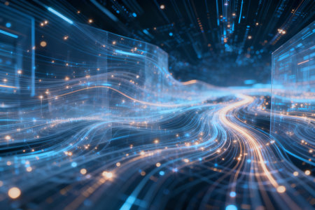 A vibrant digital stream flows through a futuristic environment, featuring glowing blue and orange elements representing data in motion and technology.