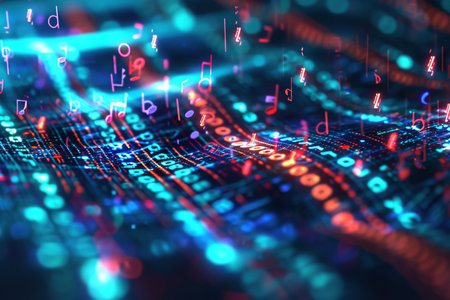 An abstract background featuring a combination of blue and pink colors with various numbers in a captivating pattern, Music notes replaced by binary code to represent digital music, AI Generated