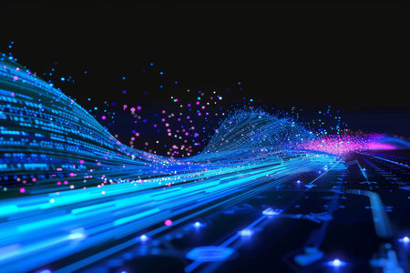 This image showcases an abstract representation of a digital data stream, highlighting vibrant glowing lines and particles to illustrate concepts of technology and communication.