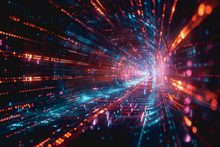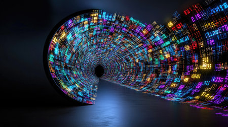 Experience the mesmerizing flow of colorful data streams in this abstract digital tunnel, showcasing a vibrant blend of light and technology.