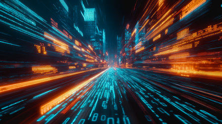 Abstract digital data streams with binary code and vibrant orange and blue light trails