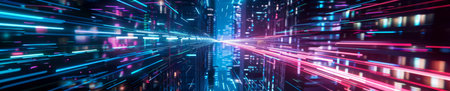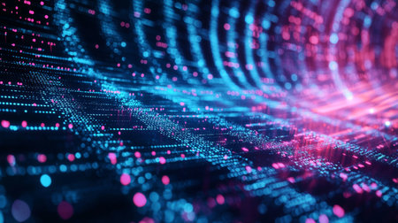 A futuristic depiction of digital data flow with neon blue and pink lights, representing advanced technology, communication networks, and data transfer.