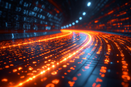 A futuristic digital stream of data in a tunnel-like structure, with bright orange and blue lights, symbolizing information flow and high-tech innovation. The image conveys speed and technology.