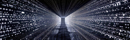 A luminous digital corridor with flowing binary sequences forms a high-tech pathway, evoking a visionary network of information in motion.