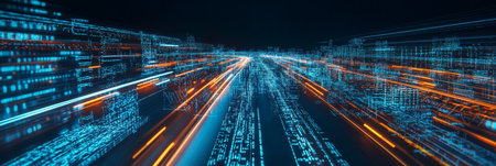 Futuristic Abstract Cityscape with Data Stream Highway and Digital Network in Seamless Background