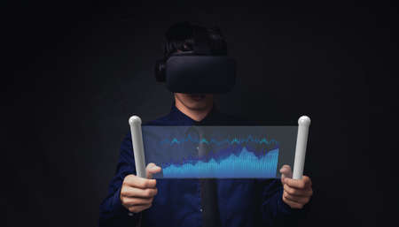 Businessman using virtual reality headset. Stock Market Investments Funds and Digital Assets and analyze forex trading graph financial data. Technology online concept.