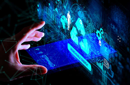 Hand touching Sustainable development FUI with icons of renewable energy and natural resources preservation.