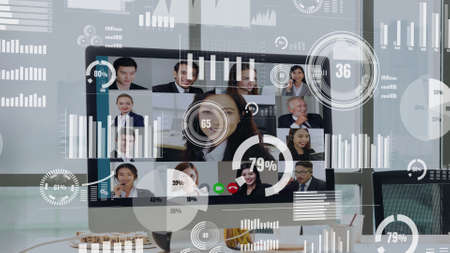 Creative visual of business people in a corporate staff meeting on video call . Concept of digital technology for marketing data analysis and investment decision making .