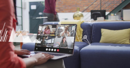 Image of financial data processing over diverse business people on laptop image call. Global finance, business, connections, computing and data processing concept digitally generated image.