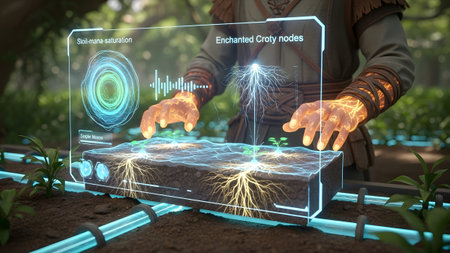 Garden showing close-up of glowing hands interacting with holographic soil analysis showing...