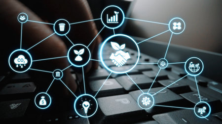 A business professional engages with virtual reality technology, visualizing net zero emissions and exploring sustainable solutions for a greener future.