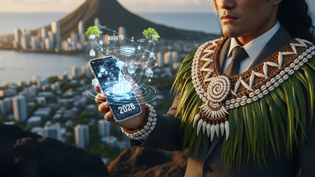 (1129) showing man in suit and traditional headdress holding smartphone with holographic assets...