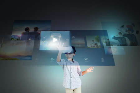 Boy with VR glasses play with a virtual videogame