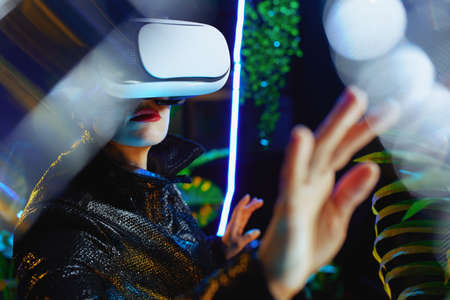 trendy 40 years old woman in virtual reality in vr headset exploring.