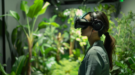 A person wearing a VR headset stands amidst a lush indoor garden, immersed in a virtual reality experience blending nature and technology.