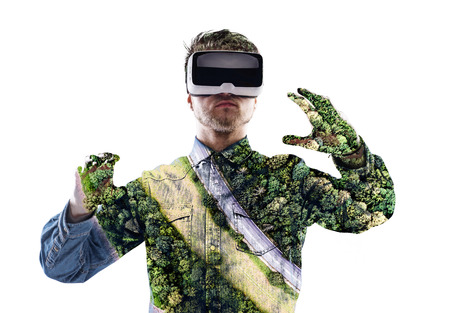 Double exposure. Man wearing virtual reality goggles. Forest. Tr