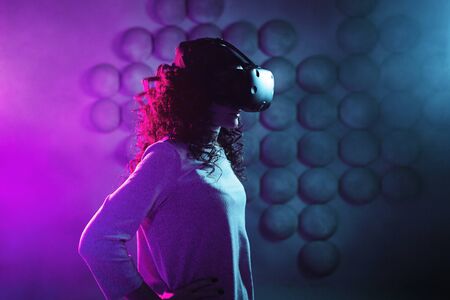 Virtual reality game. A girl in a virtual reality helmet plays a game or explores the environment. Portrait in neon light, retrowave style
