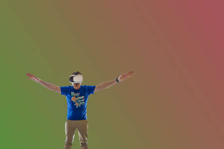 Young person with virtual reality goggles and gradient background