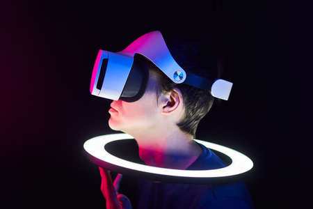 Man in a virtual reality helmet. Neon room with VR games.
