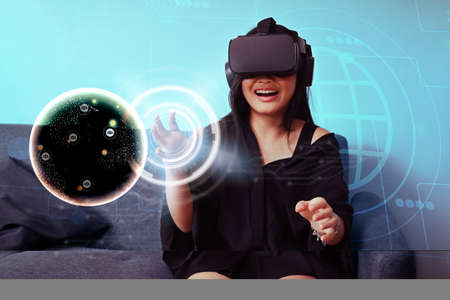 Excited asian girl wearing virtual reality glasses and touching circle hologram in the foreground.
