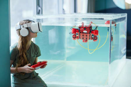 Side view portrait of girl wearing VR headset while operating robotic boat in school laboratory, copy space