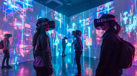 Participants engage in a captivating virtual reality experience within a vibrant and colorful light-filled space, showcasing technology's artistic potential.