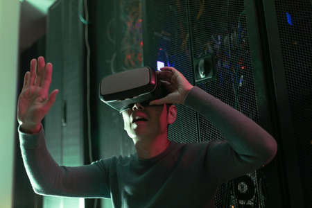 Asian man wearing vr headset while sitting in computer server room. database server and futuristic technology concept