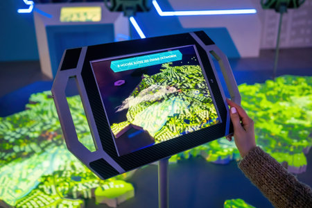 MOSCOW, RUSSIA - JUNE 05, 2019: Technology exhibition. Woman hand using touchscreen display of tablet kiosk with city street map app in dark room - close up. Navigation, journey, sci-fi concept